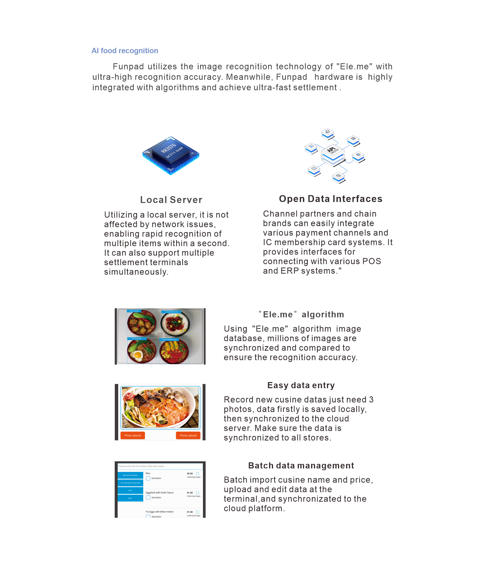 Using Al algorithm,recognition rate is upto 99.5%. Quickly identify the dishes, the system automatically generates the dishes analysis.